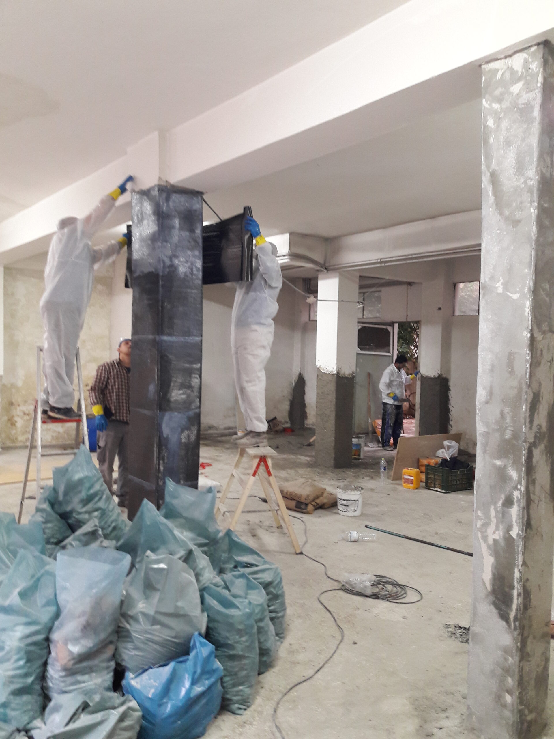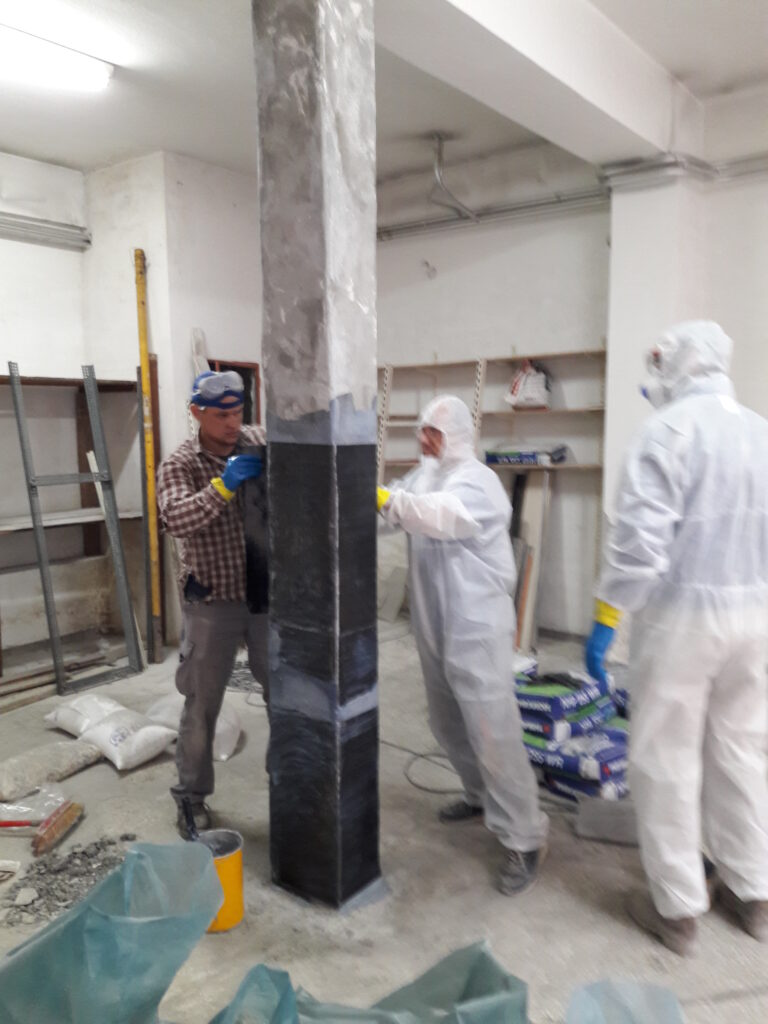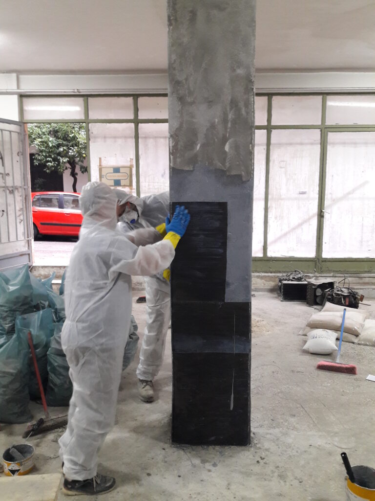 Πλήρης αποκατάσταση της Στατικής  και Αντισεισμικής Ικανότητας του Φέροντος Οργανισμού (υποστυλώματα και δοκοί) επταώροφης πολυκατοικίας με χρήση τεχνολογίας Ανθρακοϋφασματων ( Carbon-Fiber), εποξειδικών ρητινών και ινοπλισμένων κονιαμάτων.