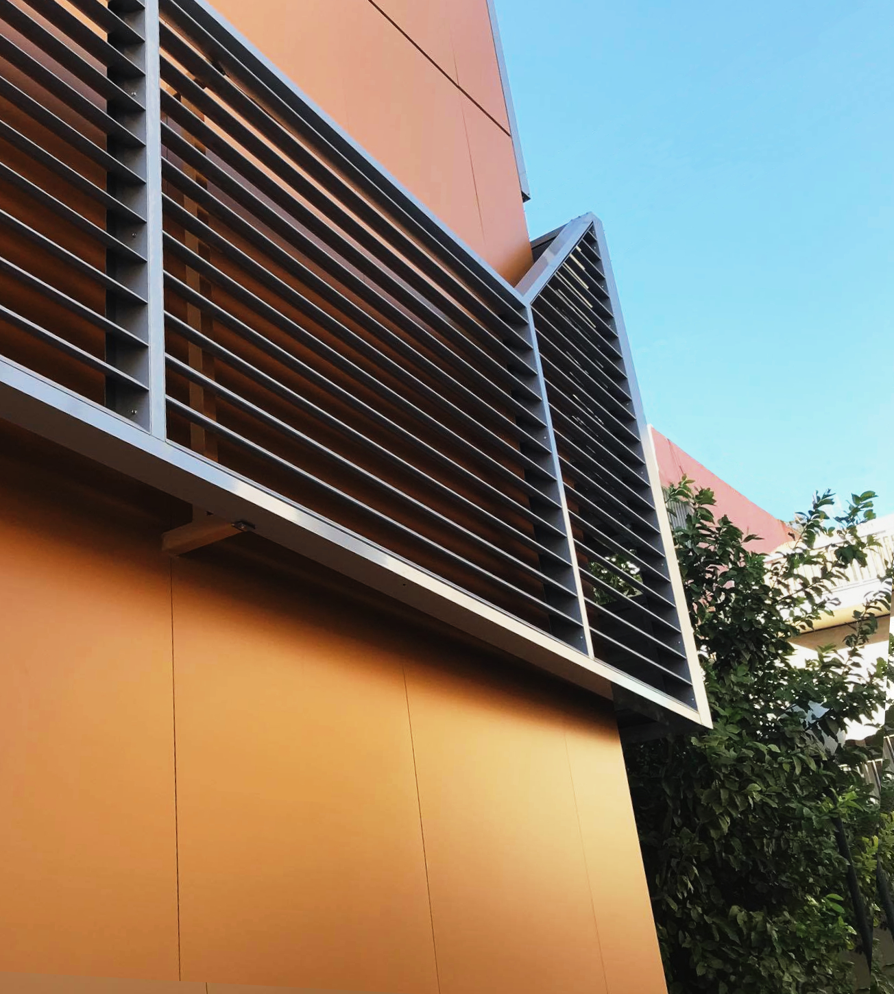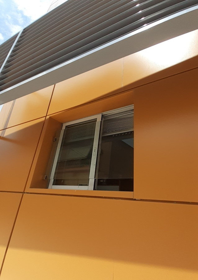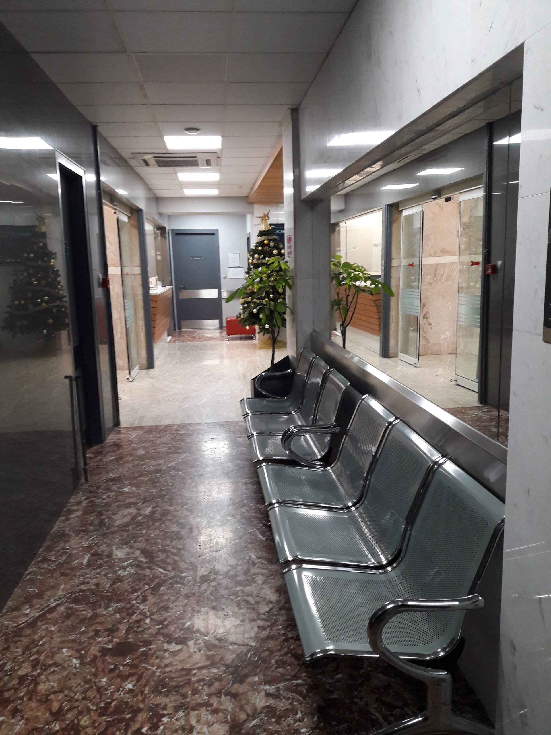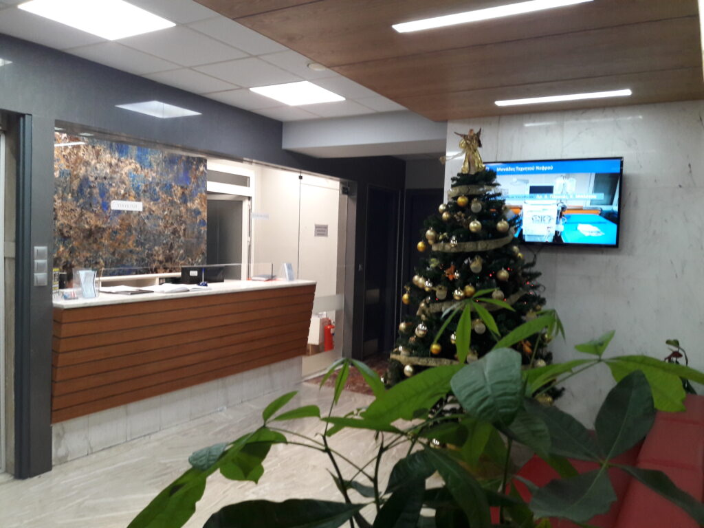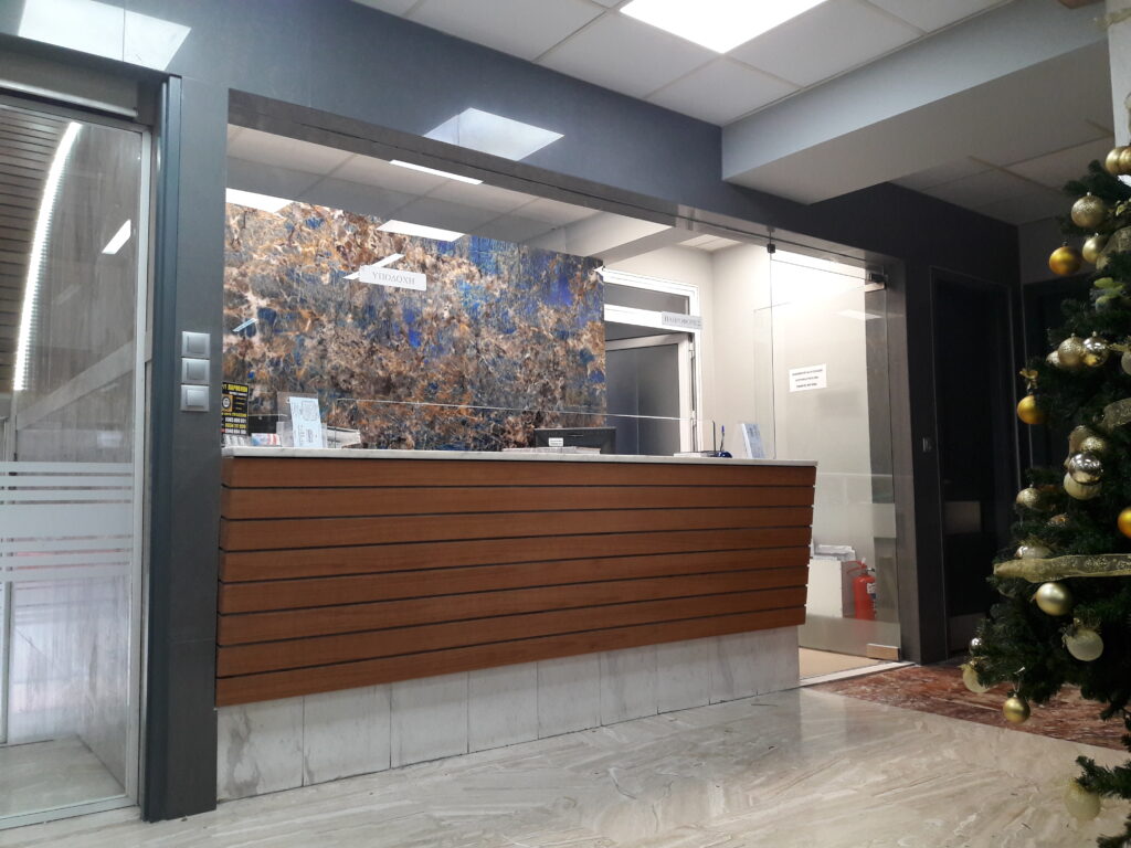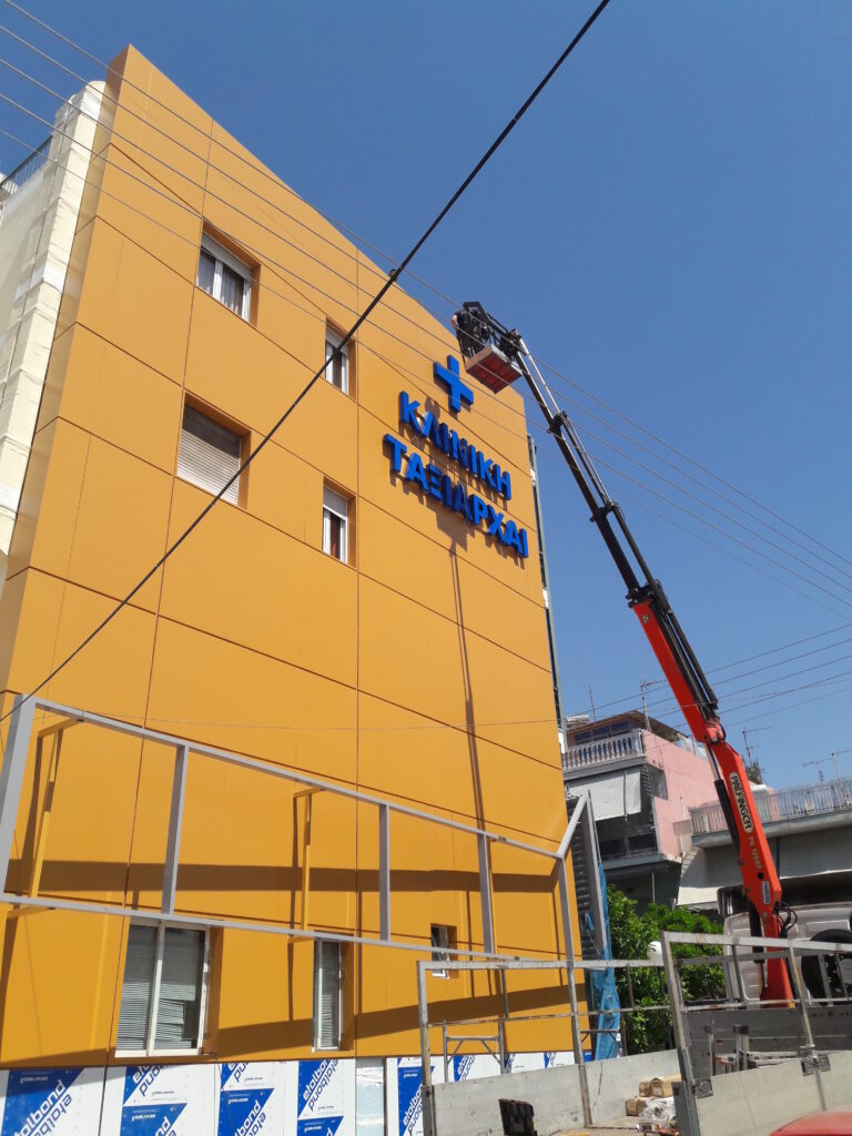 Εργασίες αναβάθμισης Όψεων του κεντρικού Κτιρίου Α’ της Κλινικής. Αντικατάσταση των παλαιών κιγκλιδωμάτων με νέα από κρύσταλλο triplex και στοιχεία inox. Προσθήκη πετασμάτων παθητικής ηλιακής προστασίας από περσίδες αλουμινίου, εξωτερική θερμομόνωση και επένδυση πλαινής όψης με φύλλα Etalbond.